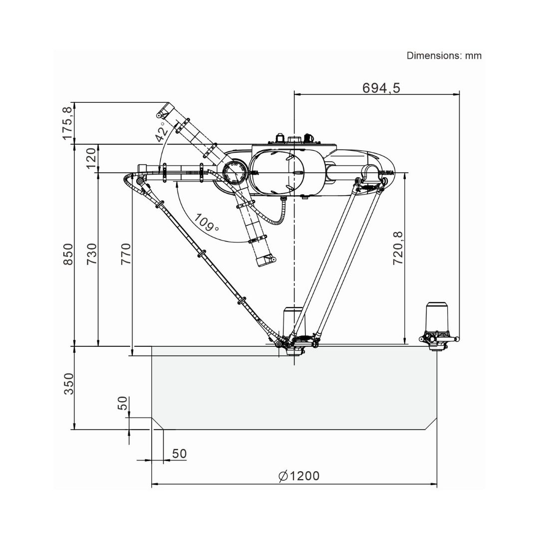 Tavana monte edilen 4 eksenli robot, 350 mm çap büyüklüğünde bir kurulum alanına sahiptir.